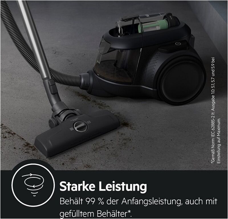 Lang anhaltende Reinigungsleistung auch bei gefülltem Staubbehälter. Behält 99 % der Anfangsleistung, auch mit gefülltem Behälter, gemäß Norm IEC 62885-2 lt. Ausgabe 1.0: 5.1, 5.7 und 5.9 bei Einstellung auf Maximum.