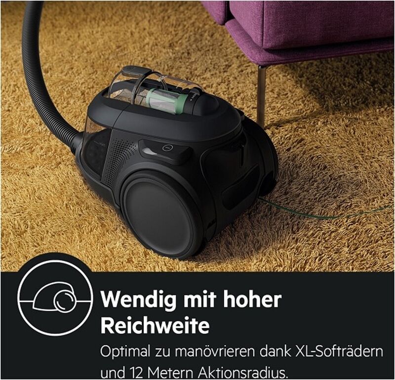 Oberflächenschonende XL-Softräder für besonders gute Wendigkeit. Komfortables Staubsaugen mit 12 m Aktionsradius.