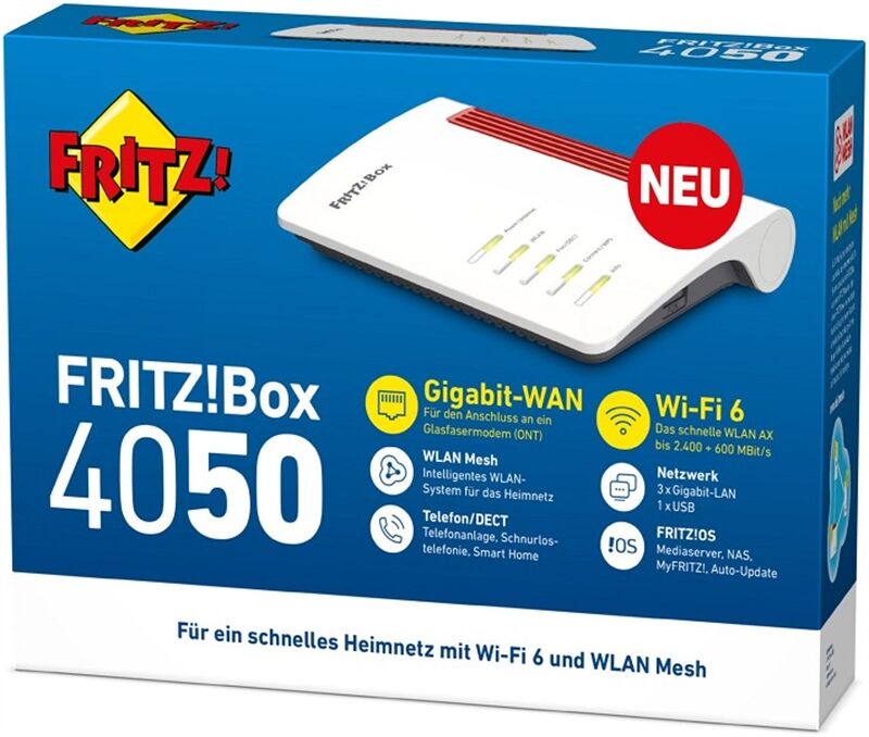 Die FRITZ!Box 4050 für Wi-Fi 6 (WLAN AX) eignet sich für den Anschluss an ein bereits vorhandenes Glasfaser- , Kabel- oder DSL-Modem. Mit bis zu 2.400 MBit/s (5 GHz) und 600 MBit/s (2,4 GHz) bietet sie eine schnelle Internetverbindung für ein rasantes Heimnetzwerk. Die FRITZ!Box 4050 bewältigt mühelos mehrere parallele 4K-Streams, Video-Chats, Downloads und Cloud-Anwendungen. Sie verfügt über einen Gigabit-WAN-Anschluss, 3 Gigabit-LAN-Anschlüsse, USB und über eine VoIP-Telefonanlage mit DECT-Basisstation. Zusätzlich bietet sie einen Anschluss für ein analoges Telefon. Durch ihre kompakte Bauweise und ihren geringen Energiebedarf ist die FRITZ!Box 4050 für den Einstieg in ein modernes vernetztes Zuhause prädestiniert.