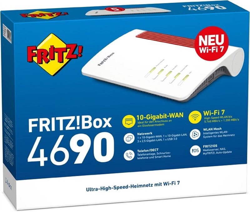 Die FRITZ!Box 4690 mit innovativem Wi-Fi 7 entfaltet ihr volles Geschwindigkeitspotenzial idealerweise an einem Glasfaser-Modem. Hier verteilt die Box das Glasfasertempo rasend schnell von bis zu 10 GBit/s über einen 10-GBit/s-WAN-Port, einen 10-GBit/s-LAN-Port und drei 2,5-GBit/s-LAN-Anschlüsse im Heimnetz. Die FRITZ!Box 4690 erreicht als Dualband-Router drahtlos bis zu 6,9 GBit/s. Über den Funkstandard DECT ULE sind vielfältige Smart-Home-Anwendungen wie Wärme und Energieeffizienz möglich.