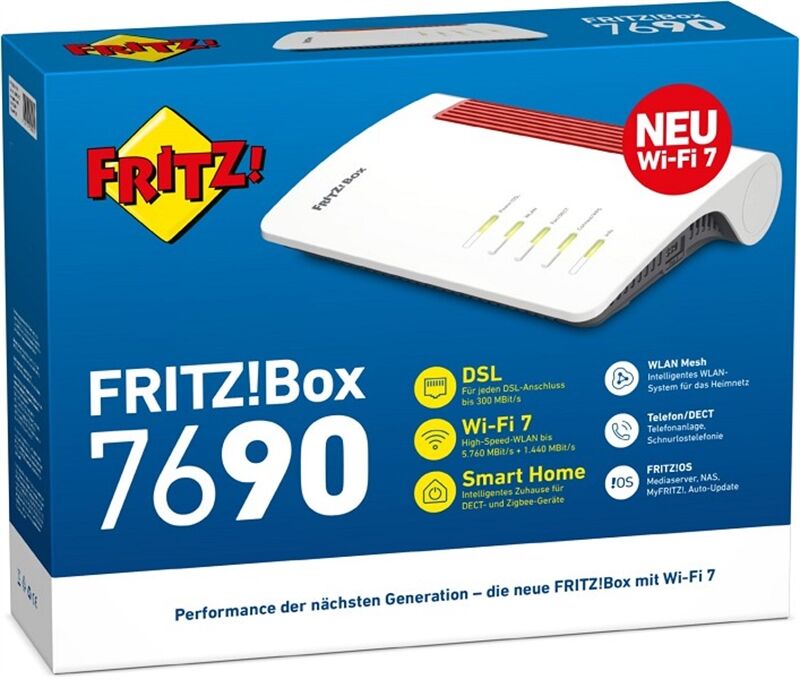 Die FRITZ!Box 7690 setzt hohe Maßstäbe am DSL-Anschluss. Ausgestattet mit innovativem Wi-Fi 7 gewährleistet die FRITZ!Box 7690 WLAN-Verbindungen mit Übertragungsraten bis zu 7.136 MBit/s. Dank fortschrittlicher Technologie können nun noch mehr Nutzer das Heimnetzwerk problemlos gleichzeitig nutzen. Die 2,5-Gigabit WAN/LAN-, 2,5-GBit/s LAN- und zwei Gigabit-LAN-Ports ermöglichen noch schnellere Verbindungen der Netzwerkgeräte mit dem Heimnetz. Zudem bietet die FRITZ!Box 7690 Erweiterungen im Bereich Smart Home: durch die Integration von Zigbee können jetzt Smart-Home-Geräte nahtlos in das Heimnetzwerk integriert werden. Das Betriebssystem FRITZ!OS ermöglicht eine problemlose Einbindung und Steuerung dieser Geräte. Zudem sorgen sehr hohe Sicherheitsstandards (WPA3/WPA2) für guten Schutz.