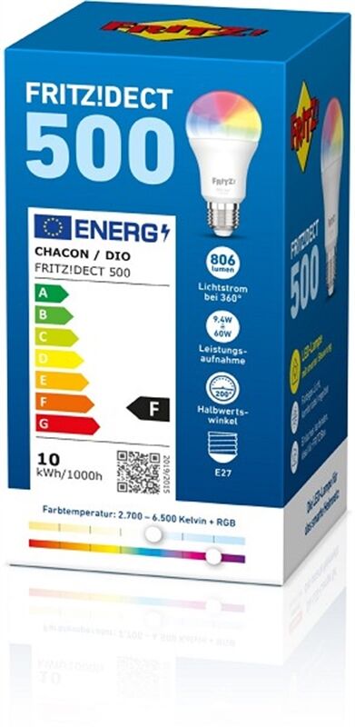 Mit FRITZ!DECT 500 ergänzt AVM sein Smart-Home-Portfolio um eine intelligente LED-Lampe für farbiges und weißes Licht. FRITZ!DECT 500 unterstützt den Smart-Home-Standard DECT ULE und lässt sich auf Knopfdruck ganz einfach in das FRITZ!-Heimnetz einbinden. So wird eine FRITZ!Box in Verbindung mit FRITZ!DECT 500 zur Zentrale eines intelligenten Lichtsystems. FRITZ!DECT 500 ist für die weit verbreiteten E27-Fassungen geeignet.