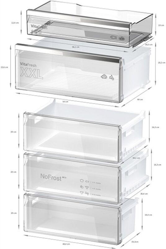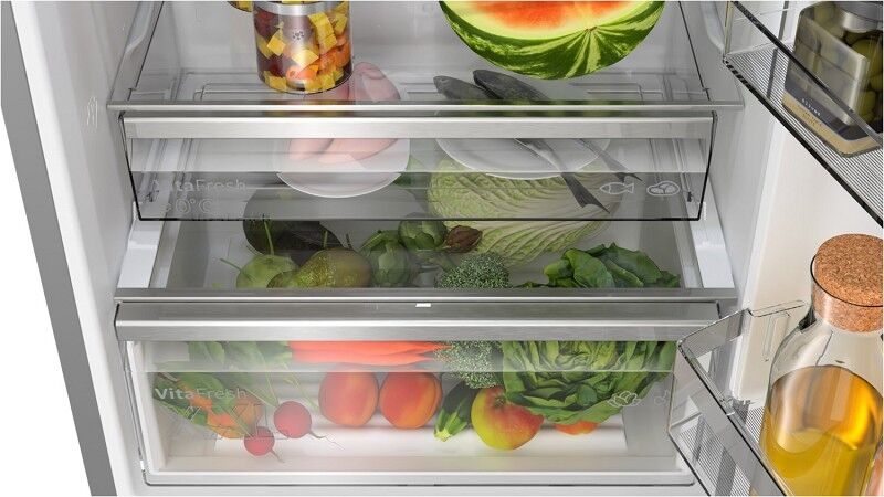 • VitaFresh XXL <0°C>: extragroße Schubladen mit Feuchtigkeitsregulierung für länger frische Lebensmittel.