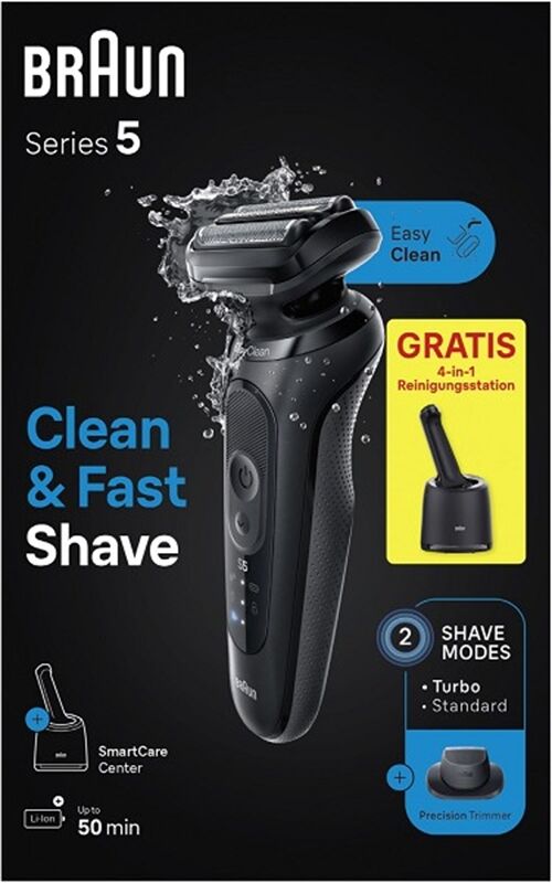 Entdecke den Braun Series 5 Elektrorasierer für Herren – für eine schnelle und glatte Rasur!Mit dem Braun Series 5 Rasierer erfüllst du all deine Rasurbedürfnisse mühelos. Die 3 flexiblen Klingen passen sich perfekt an die Konturen deines Gesichts an und sorgen für ein sanftes Ergebnis. Wähle den Turbo-Modus für eine superschnelle Rasur, wenn es darauf ankommt, oder den Standard-Modus für eine ausgewogene, gründliche Pflege.Dank der vielseitigen Aufsätze kannst du deinen Rasierer ganz individuell anpassen und optimal nutzen. Ob für eine präzise Konturierung oder das schnelle Entfernen von Bartstoppeln – der Braun Series 5 lässt keine Wünsche offen.Die AutoSense-Technologie erkennt die Dichte deines Bartes und passt die Leistung automatisch an, sodass du immer die perfekte Rasur erhältst. Und das Beste: Der Rasierer ist wasserdicht, was die Reinigung zum Kinderspiel macht.Hergestellt in Deutschland, bietet dir der Braun Series 5 die Qualität und Langlebigkeit, die du verdienst. Erlebe jetzt die Zukunft der Rasur und verwöhne dich mit einem Ergebnis, das begeistert!Im Lieferumfang enthalten: 1x Series 5 Rasierer, 1x GRATIS Reinigungsstation, 1x Reinigungskartusche, 1x Präzisionstrimmer-Aufsatz, 1x Schutzkappe, 1x SmartPlug, 1x Reinigungsbürste