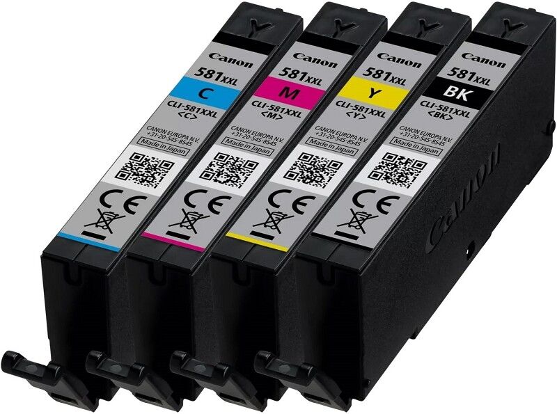 Das CLI-581XXL Multipack beinhaltet je einen 11,7 ml fassenden Schwarz-, Cyan-, Magenta- und Gelb-Tintentank mit sehr hoher Reichweite für den Druck hochwertiger Fotos und Dokumente. Die Tintentanks bieten eine besonders hohe Reichweite und sind damit besonders kostensparend: Damit druckst du bis zu 3,2 mal so viele Seiten wie mit der Standard-Tinte. Die XXL-Fototinten ermöglichen Reichweiten bis zu: Gelb XXL 322 Fotos*, Magenta XXL 367 Fotos*, Schwarz XXL 858 Fotos*, Cyan XXL 282 Fotos*.