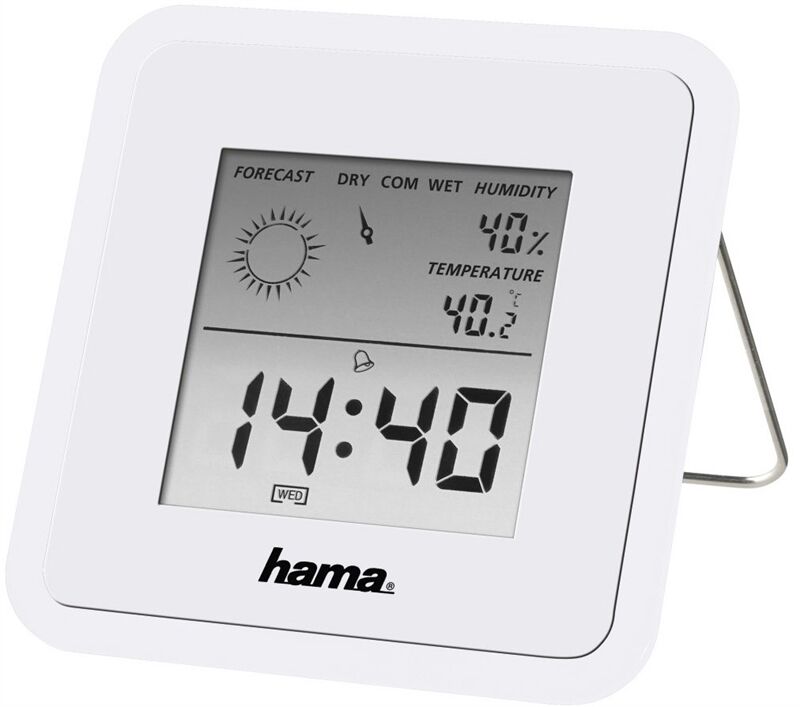 Ausstattung - Thermometer - Betriebsart: Batterie-Betrieb - Batterien im Lieferumfang - Anzahl benötigter Batterien: 1 Leistungseigenschaften - Gerätetyp: Hygro-Thermometer - Luftbefeuchter: Temperatur-/Luftfeuchtigkeitsanzeige - LCD-Display - 12/24-Std.-Anzeige - Anzeige von Datum/Uhrzeit - Tagesanzeige - Snooze-Funktion - Alarm-Funktion - Temperaturanzeige umschaltbar auf ° F - Wohlfühlindikator - Wettervorhersage Gehäuse-Eigenschaften - Bauart: Standgerät - Breite (cm): 8 - Höhe (cm): 8 - Tiefe (cm): 1.2 Farben - Gehäuse-Farben: weiß