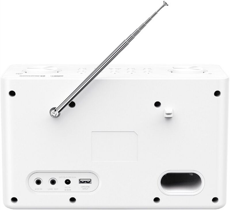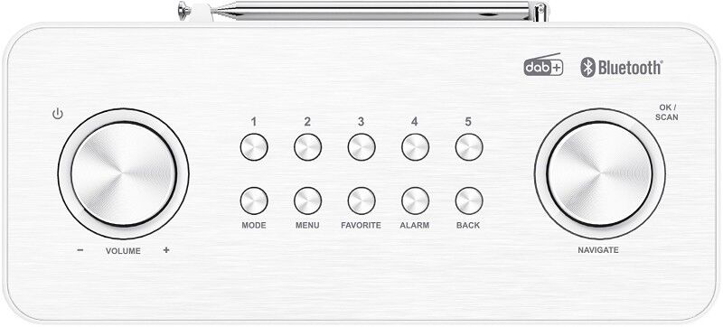 Heimradio bestehend aus: - Fernbedienung Empfangseigenschaften - Tuner-Empfang: Tuner für UKW/DAB+ - Radio-Data-System (RDS): Radio-Data-System (RDS) - RDS mit Radiotext (RT) - RDS mit Programmart-Kennung (PTY) Bedienung - Anzahl Stationsspeicher: 40 - Weckfunktion - Sleep-Funktion Ton-Wiedergabe/Einstellung - Lautsprecher-System: Bassreflex-System - Ton über eingebaute Lautsprecher: Stereo-Ton über eingebaute Lautsprecher - Musikleistung (W): 20 - Musikleistung (W), pro Kanal: 10 Display/Anzeigen - Display am Gerät - Uhrzeit-Anzeige Anschlüsse - Kopfhörer-Anschluss - Aux (IN) - Bluetooth-Schnittstelle Gehäuse-Eigenschaften - Breite (cm): 24.5 - Höhe (cm): 14.5 - Tiefe (cm): 11.5 - Gewicht (kg): 1.7 Farben - Gehäuse-Farben: weiß
