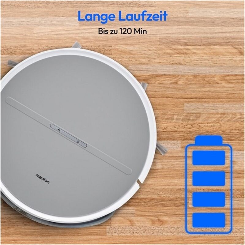 • Lange Laufzeit: Mit einer Akkuladung reinigt der Roboter bis zu 120 Minuten lang. So werden auch große Zimmer oder mehrere Räume ohne Pause gesaugt