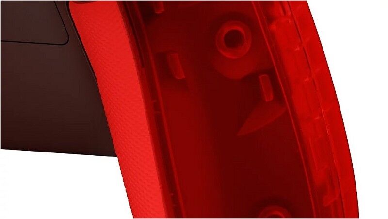 Gehäuse und seitliche Kappen sind transparent rot, sodass du das metallische, silberfarbene Innere sehen kannst.