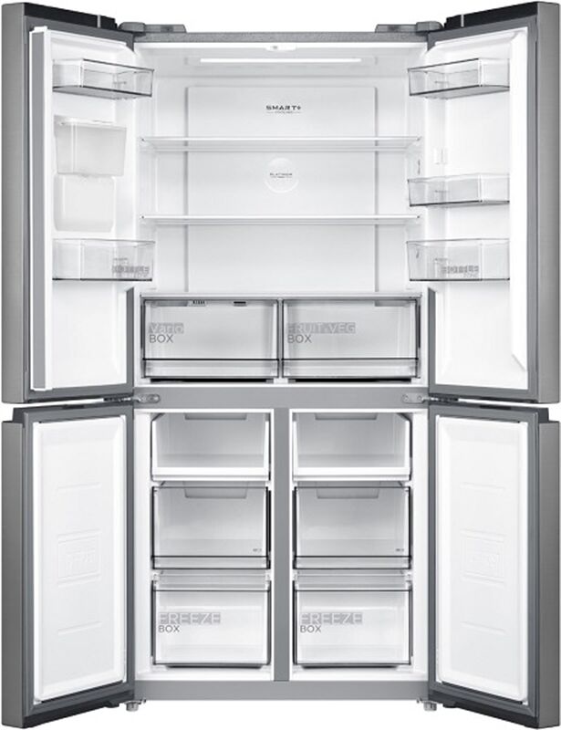 Verbrauchs-Eigenschaften - Angabe gem. EU-Verordnung 2019/2016 - Energieeffizienzklasse: Energieeffizienzklasse D - Energieeffizienzspektrum: Spektrum [A bis G] - Energieverbrauch in kWh/Jahr: 236 - Energieeffizienzindex: *: 80 - 220-240V 50/60Hz Netzanschluss - Absicherung (A): 1.8 Leistungseigenschaften - Klimaklasse: Klimaklasse SN/N/ST/T - Gefrierteil oben/unten: Gefrierteil unten - Gefrierfach: 4-Sterne-Gefrierfach - Gefriervermögen in 24 Std. (kg): 13 - Lagerzeit bei Störung (Std.): 12 - gesamter Nutzinhalt (l): 470 - Nutzinhalt Kühlraum (l): 301 - Nutzinhalt Gefrierraum (l): 169 - Superkühlen-Schaltung - Super-Gefrier/Super-Frost-Funktion - No-Frost-Technik gegen Vereisung - elektronische Temperaturregelung - Inverter-Technologie - Geräusch-Schallleistung (dB): 37 - Geräuschemissionsklasse: Geräuschemissionsklasse C Bedienung - Ort der Temperaturanzeige: Temperaturanzeige außen - Art der Temperaturanzeige: Temperatur-Digital-Anzeige - wählbare Kühlteil-Temperatur - wählbare Gefrierteil-Temperatur - Temperaturwahl: Temp. für Gefriert. unabh. vom Kühlteil - Tür offen-Warnsignal (Art): opt. Tür offen-Warnsignal - Abtauverfahren (Kühlraum): Abtauautomatik im Kühl- und Gefrierteil - kindersichere Bedienelemente Kühlraum-Ausstattung - Umluft-Kühlen - LED-Innenraum-Beleuchtung - antibakt.+sterilisier. Reinigungsfunkt. - Anzahl der Sicherheitsglasplatten: 3 - Anzahl der Gemüseschalen: 2 - Feuchteregelung für Gemüsefach Gefrierteil-Ausstattung - Anzahl Fächer/Schubladen, gesamt: 6 - Anzahl der Schubladen: 4 - Anzahl der Fächer: 2 - transparente Gefrier-Schubfächer Kühlschranktür-Ausstattung - getrennte Kühltüröffnung - Anzahl der Türregale: 6 Ausstattung - Display: Touch Control-Bedienung Gehäuse-Eigenschaften - Breite (cm): 83.3 - Höhe (cm): 177.5 - Tiefe (cm): 65.3 - Leergewicht (kg): 96 - Anzahl der Türen: 4 - integrierte Griffmulde Verpackungsangaben - Breite mit Verpackung (cm): 88.5 - Höhe mit Verpackung (cm): 190 - Tiefe mit Verpackung (cm): 71 - Gewicht mit Verpackung (kg): 105 Farben - Gehäuse-Farben: edelstahl