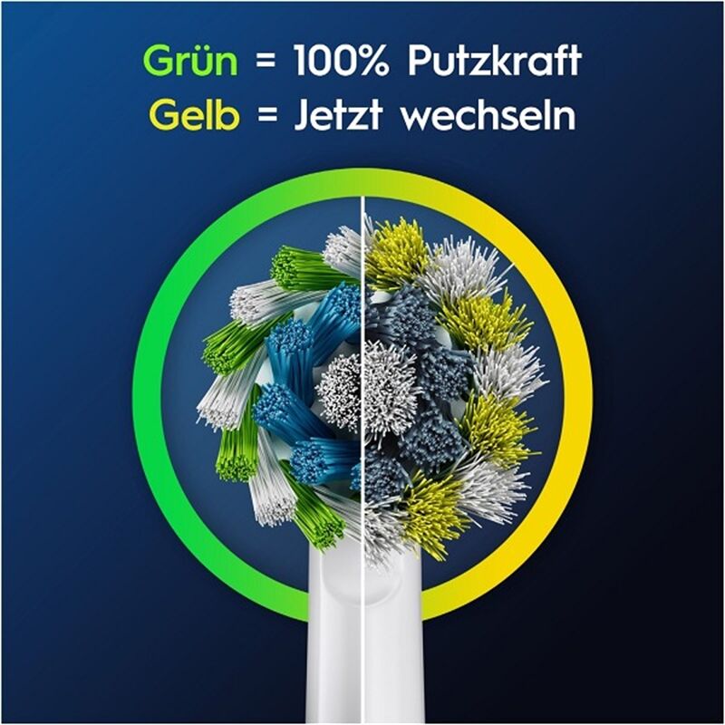 • Grüne Indikator-Borsten färben sich mit der Zeit je nach individueller Nutzung gelb und zeigen damit den optimalen Zeitpunkt zum Wechseln der Aufsteckbürste an - für 100% Putzkraft