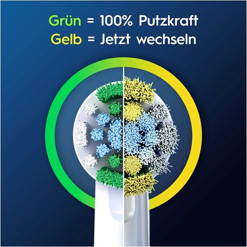 • Grüne Indikator-Borsten färben sich mit der Zeit je nach individueller Nutzung gelb und zeigen damit den optimalen Zeitpunkt zum Wechseln der Aufsteckbürste an - für 100% Putzkraft