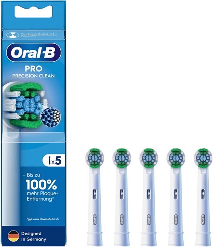 Der Oral-B Pro Precision Clean Bürstenkopf passt sich perfekt an jeden Zahn an und entfernt bis zu 100% mehr Plaque als eine Handzahnbürste. Die Original-Bürstenköpfe von Oral-B wurden mit neuen X-förmigen Borsten entwickelt, die nun auch die Stellen reinigen, die normale Borsten nicht erreichen können. Die grünen Indikator-Borsten färben sich mit der Zeit je nach individueller Nutzung gelb und zeigen damit den optimalen Zeitpunkt zum Wechseln der Aufsteckbürste an - für 100% Putzkraft. Garantierte Passform mit allen wiederaufladbaren Zahnbürsten von Oral-B, außer Pulsonic und iO.
