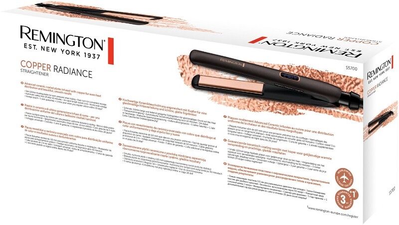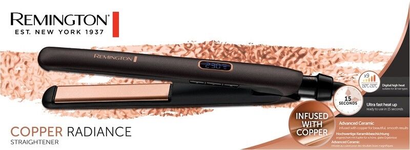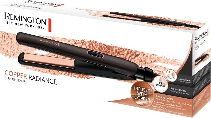 Dank hochwertiger Keramikbeschichtung angereichert mit Kupfer ermöglicht der Copper Radiance Haarglätter schöne, glatte Ergebnisse und eine Ultra-Schnellaufheizung in 15 Sekunden. Das digitale Display mit 9 Temperatureinstellungen, sowie die schmalen, 110 mm langen und federnd gelagerten Stylingplatten bieten optimale Voraussetzungen für alle Haartypen und glatte Ergebnisse in nur einem Zug.