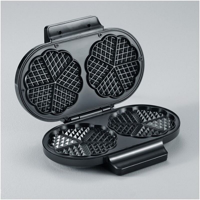 Leistungseigenschaften - max. Heizleistung (W): 1600 Waffeleisen-Ausstattung - * Waffeln gleichzeitig: 2 - Beschichtung: Antihaft-Beschichtung - Herzwaffeln Bedienung - Temperaturregelung: stufenlose Temperatureinstellung - Anzahl der Kontrollleuchten: 2 - Aufheiz-Kontrollanzeige - Betriebskontrollanzeige - manuelle Kabelaufwicklung Gehäuse-Eigenschaften - Kunststoff-Gehäuse - Hochkant-Aufbewahrung Farben - Gehäuse-Farben: schwarz