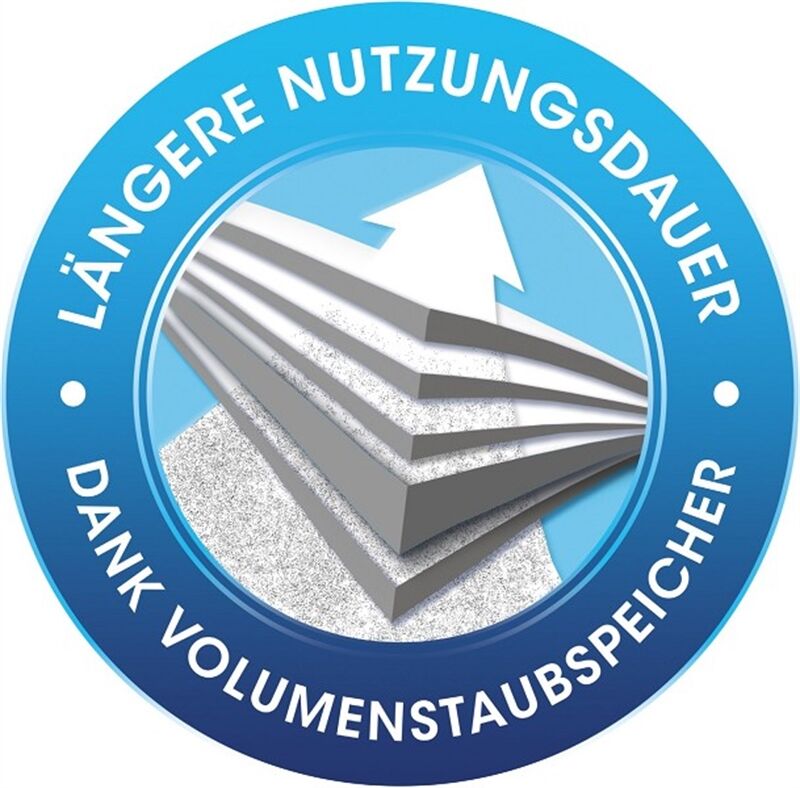 Der Volumenstaubspeicher und die abgerundeten Ecken stellen eine optimale Ausnutzung des Staubraums sicher und ermöglichen somit eine längere Verwendungsdauer des Beutels. Sollte der Beutel doch einmal voll sein, ist die Entsorgung dank des praktischem